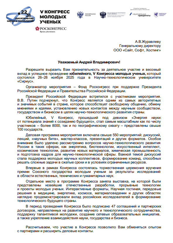 За участие в конгрессе Журавлев Андрей получил официальное благодарственное письмо от Советника Президента Российской Федерации и руководителя межведомственной рабочей группы по подготовке и проведению Конгресса молодых ученых и мероприятий-спутников Кобякова Антона Анатольевича.